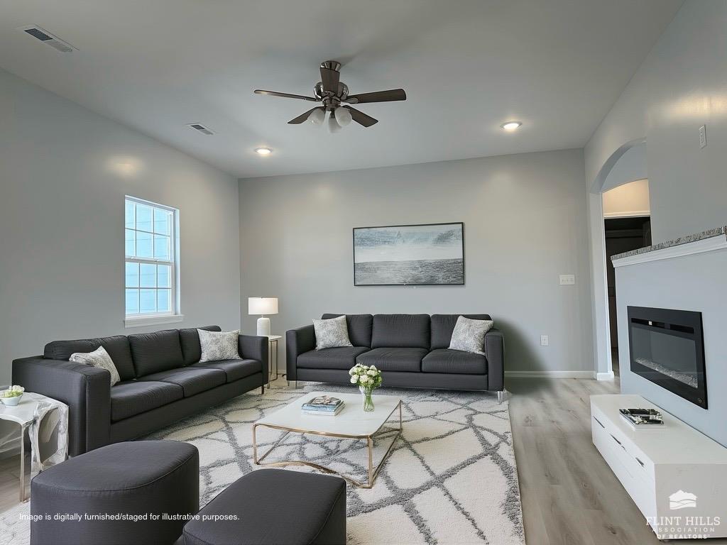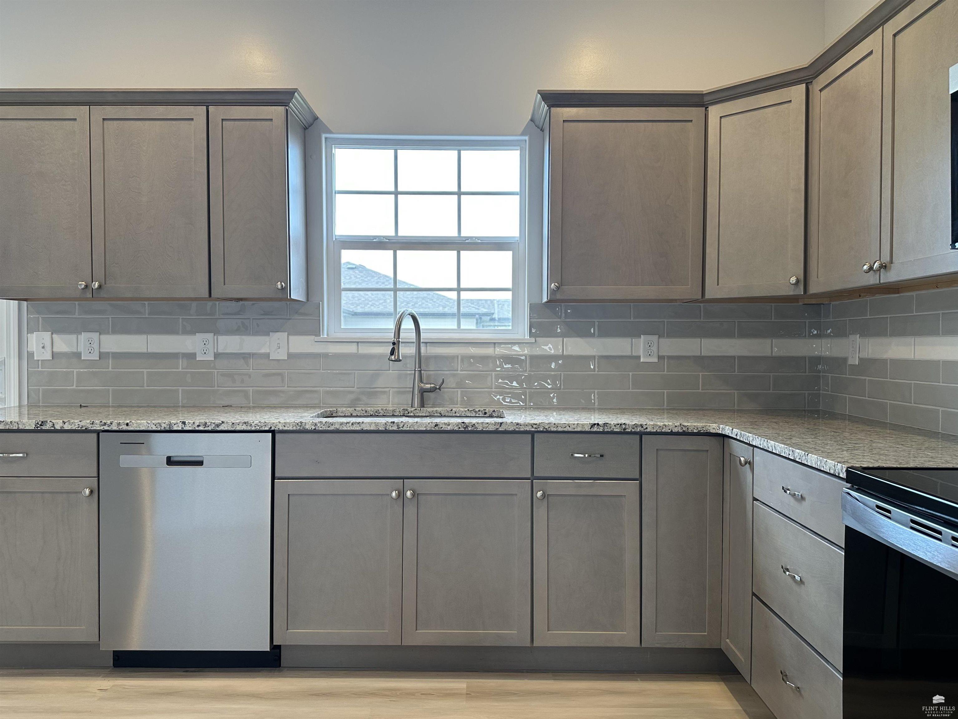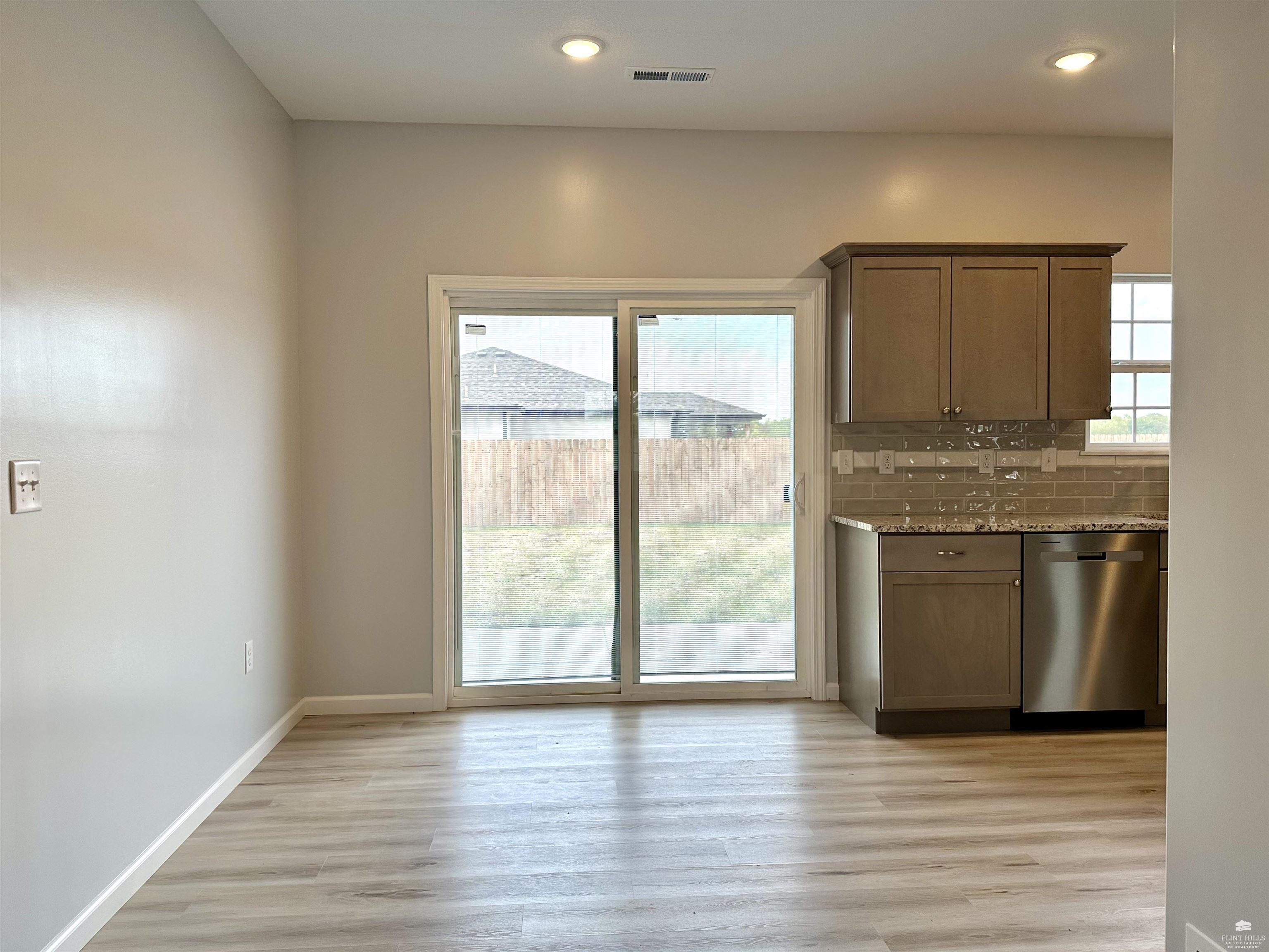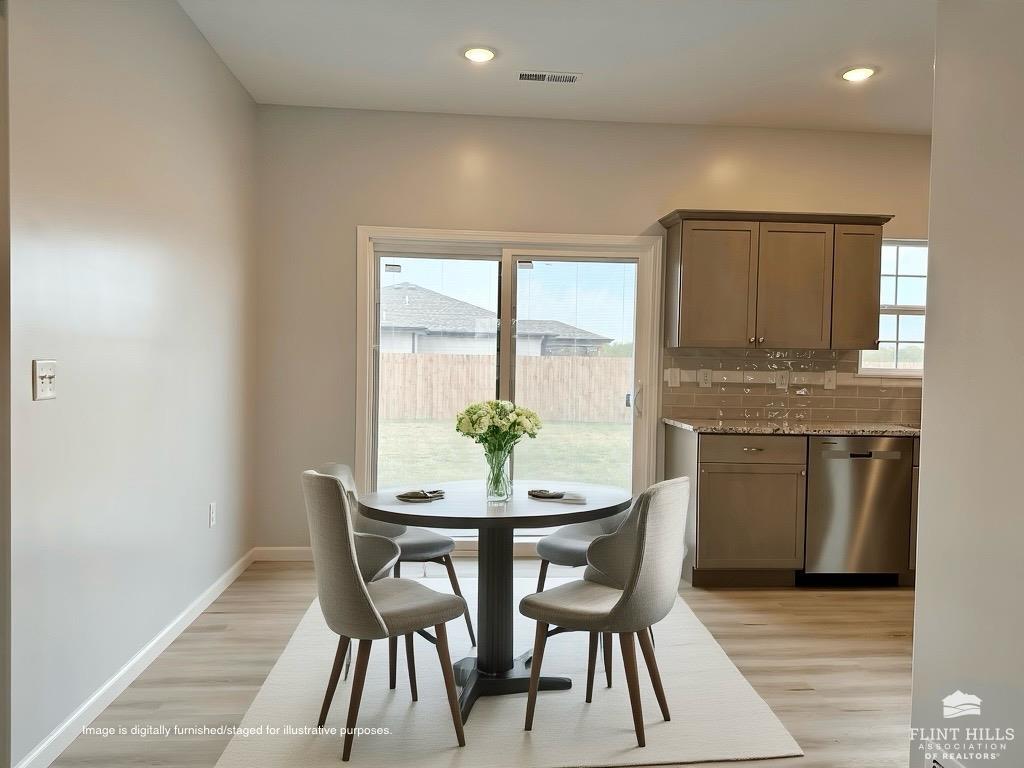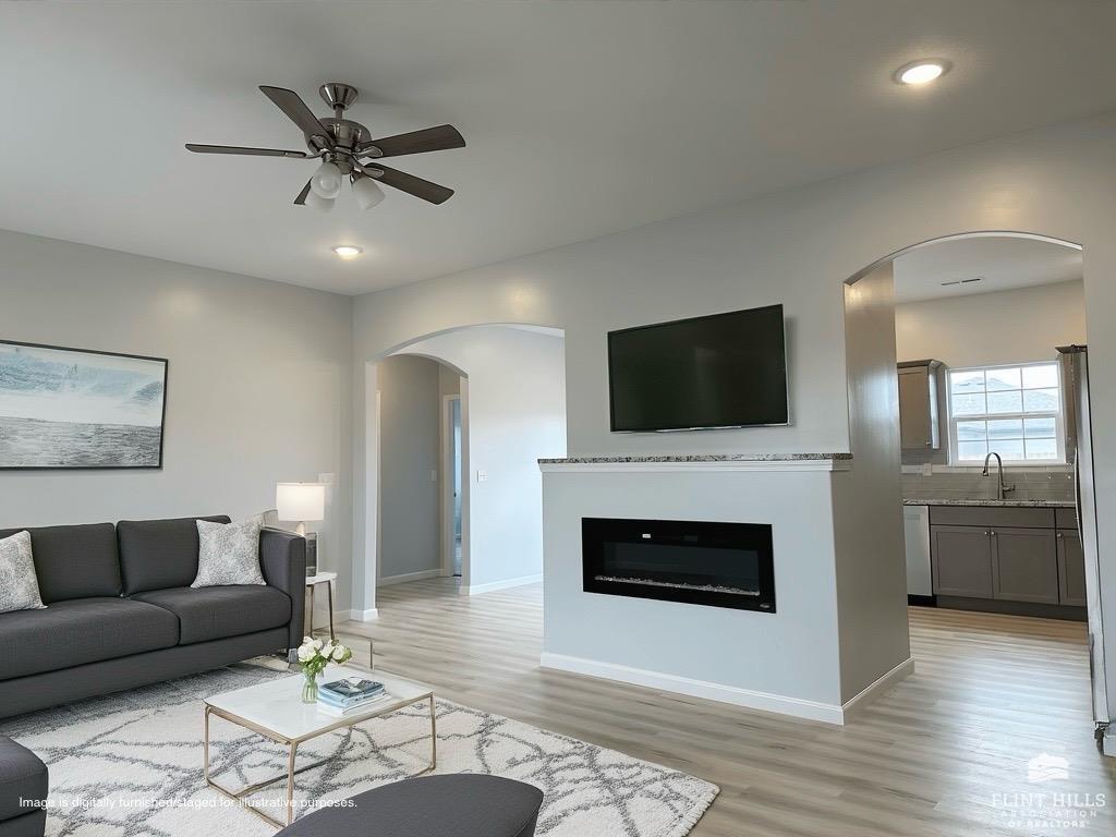 New construction home on a 0.34-acre lot in Willow Glen with no home to be built between this one and the neighbor—offering added privacy! This split-bedroom floor plan features an open living room with a cozy fireplace, dining area, and kitchen with granite countertops and a pantry. Enjoy LVP flooring throughout. The master suite includes a tile shower, dual sinks, and a walk-in closet with built-in shelving. Bedrooms 2 & 3 have closets with shelving, and the laundry room provides extra storage as well. A safe room adds peace of mind during Kansas storms. Community Park and pool included. Call/Text Peggy directly for your personal tour or more information: 785-706-3303.