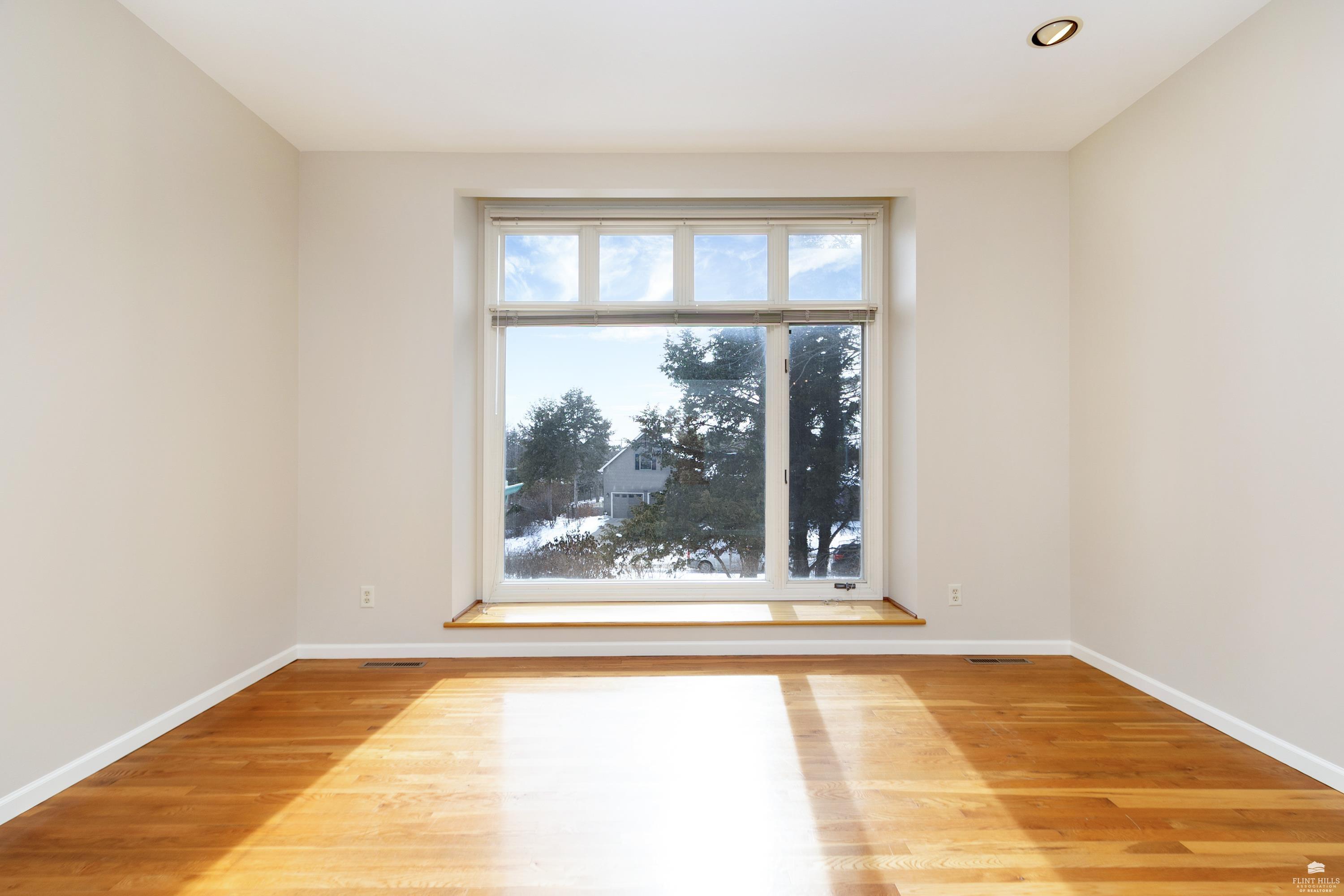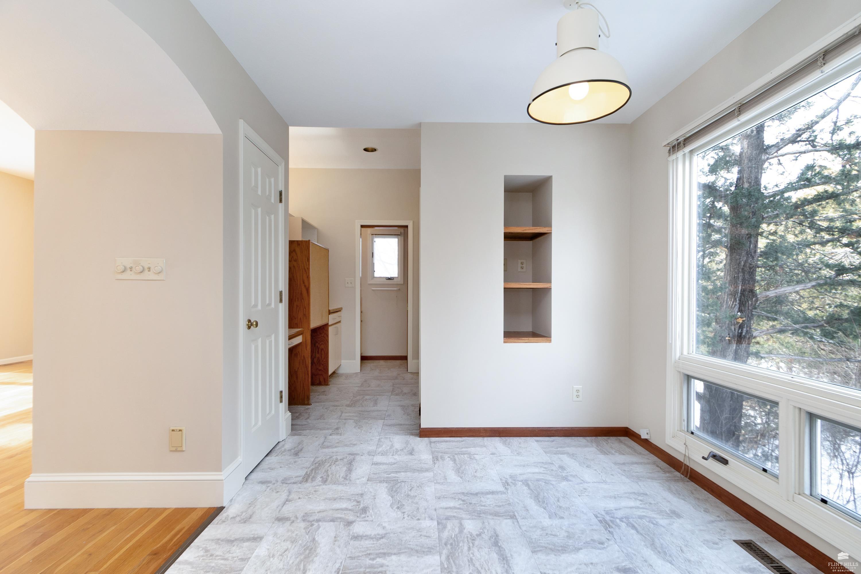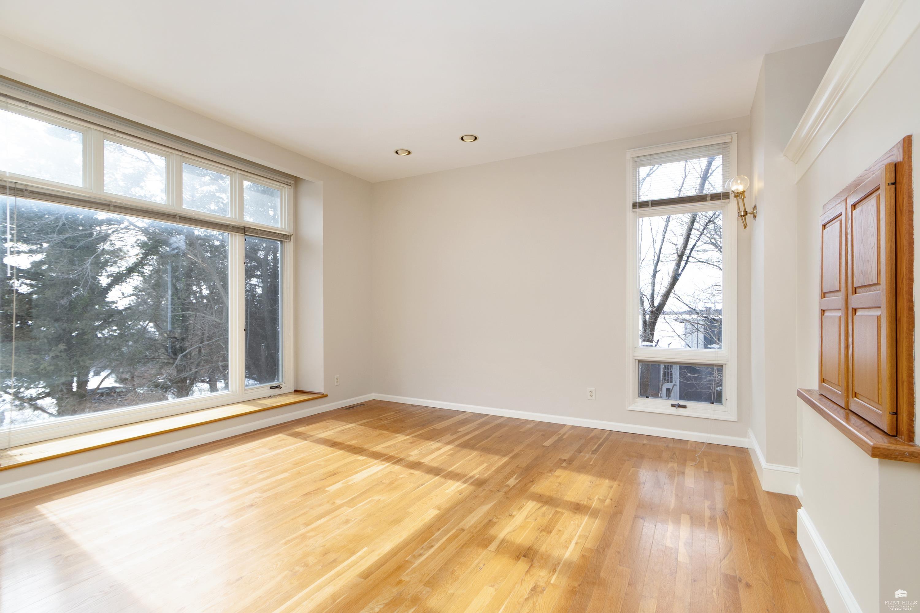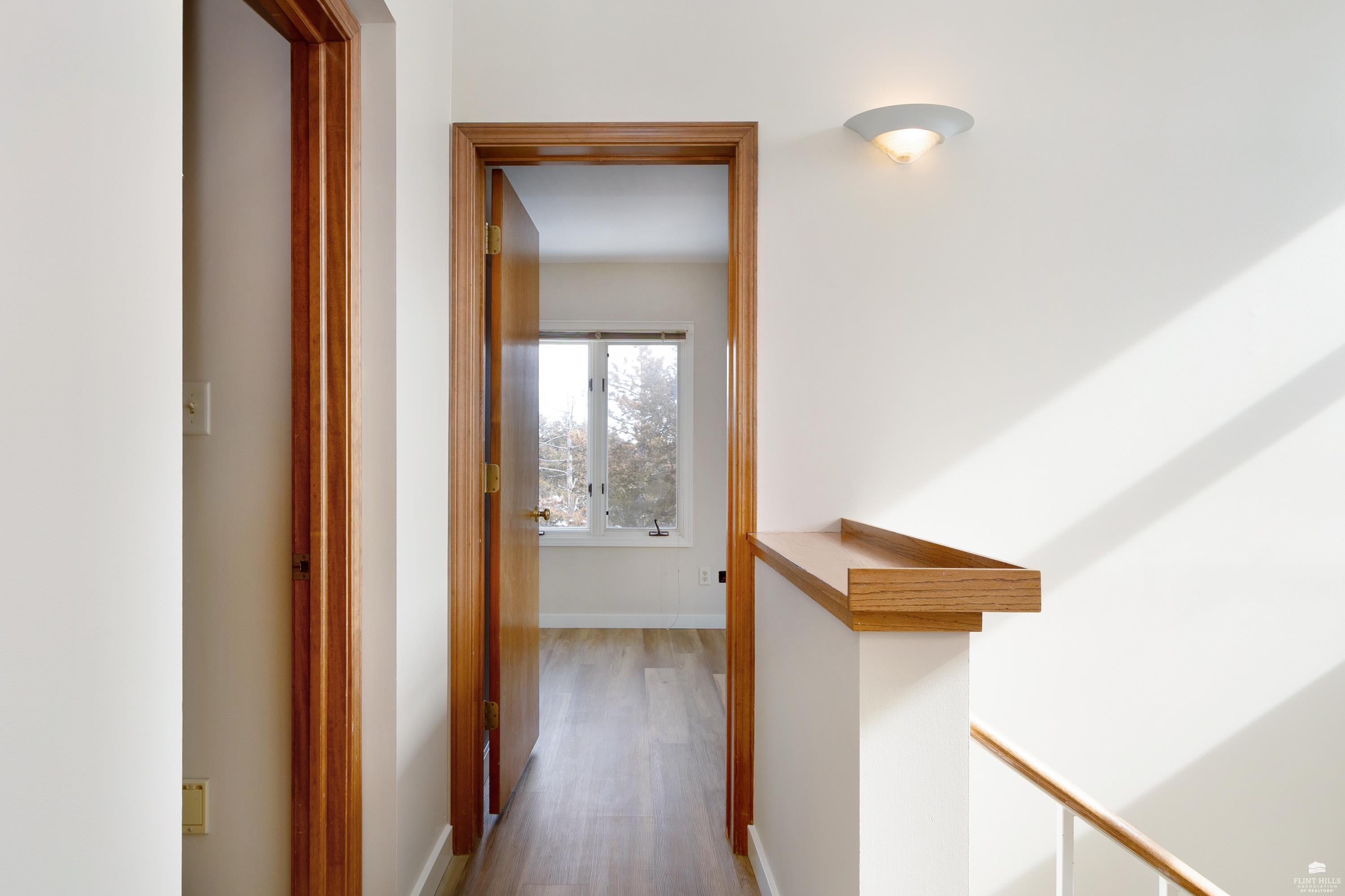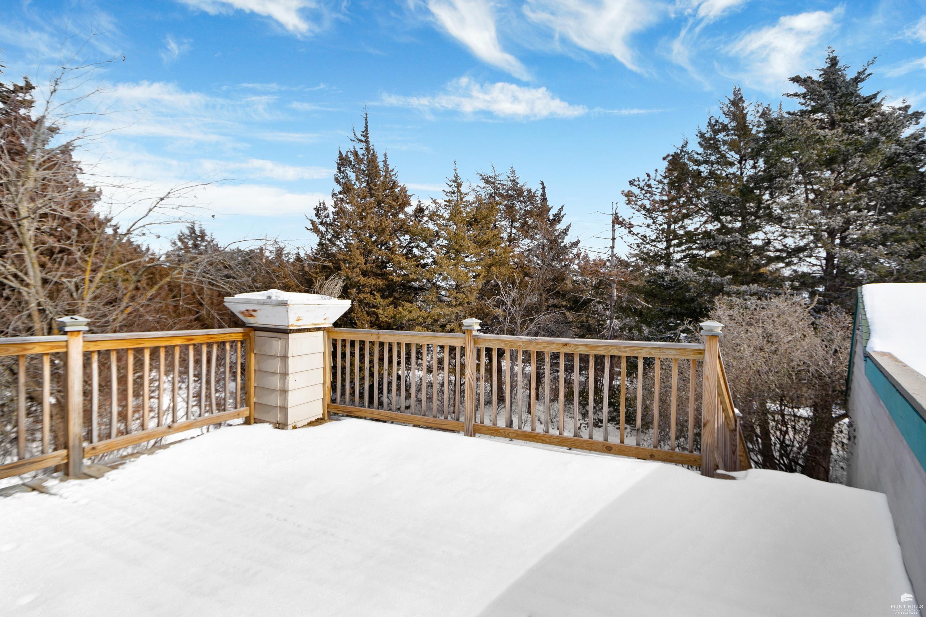 OPEN SUN FEB 8 12:00-1:00 PM Step into this three-plus bedroom contemporary home where dramatic design meets everyday functionality. A soaring entryway welcomes you inside, opening to living and dining areas highlighted by 9-foot ceilings and an outstanding multi-level architectural layout that offers both visual interest and an exceptional amount of built-in storage throughout. The entire upper level is dedicated to a private primary retreat, creating a true sanctuary. The spacious primary sleeping area features a walk-in closet and a generous 11'5" x 9'10" primary bath, complete with an oversized Whirlpool tub, shower, double vanity, and an impressive amount of custom storage. Connected to the primary suite is a 23'5" x 15'6" sitting room or office, offering incredible flexibility. With its own private entrance and closet, this space can function as a fourth bedroom. Situated on a private corner wooded lot with panoramic views. Close to KSU and minutes from the Fort Riley Ogden Gate.
