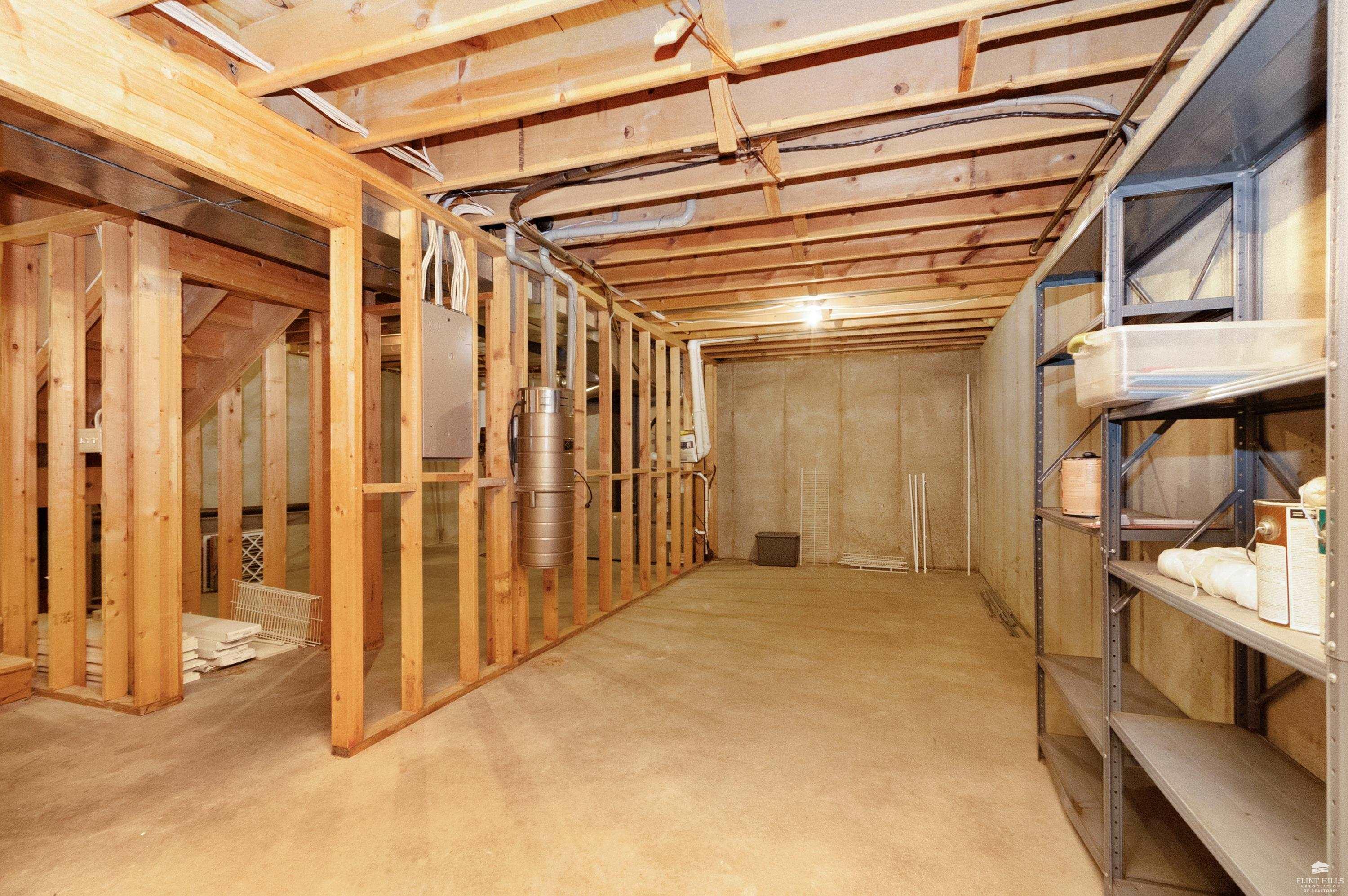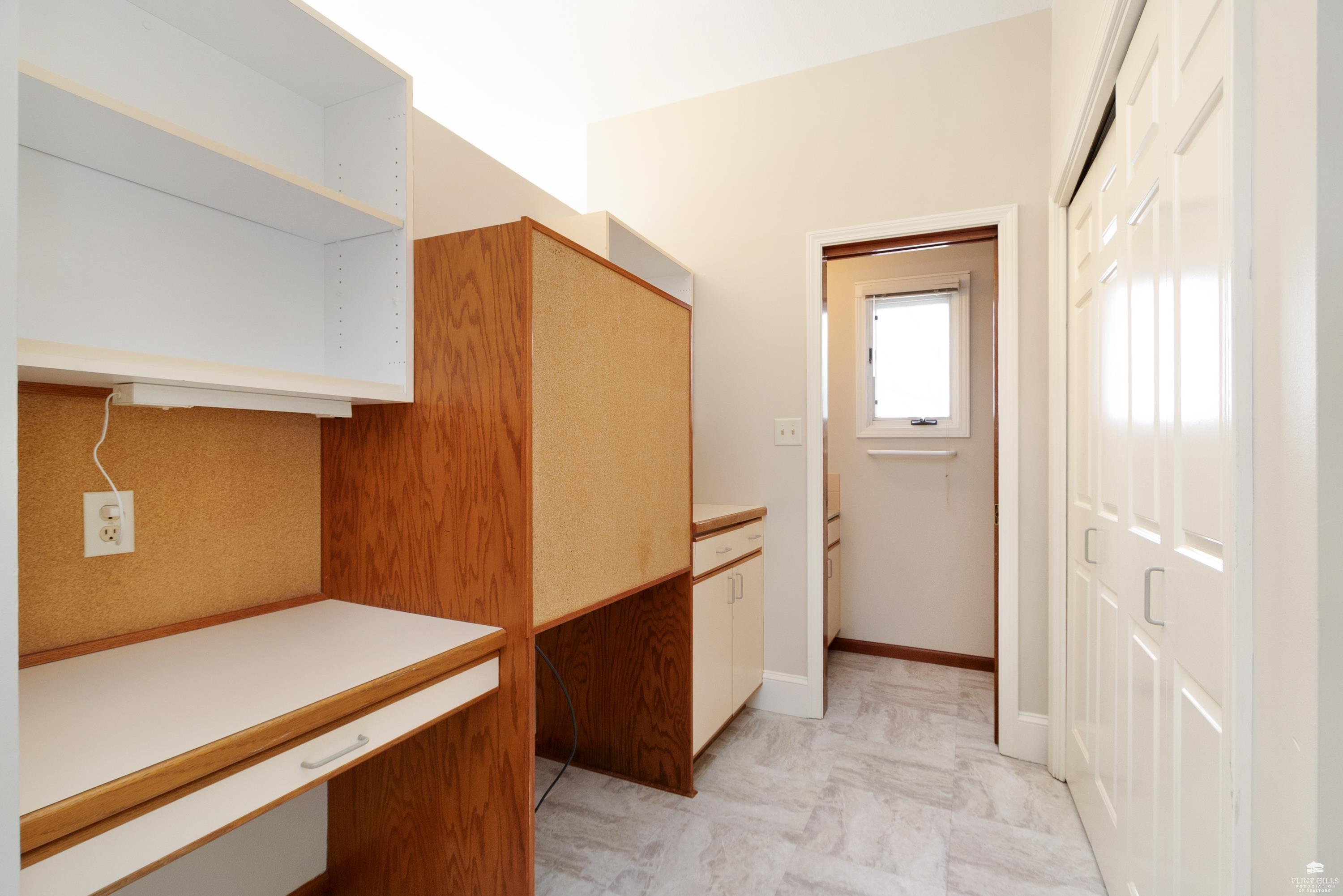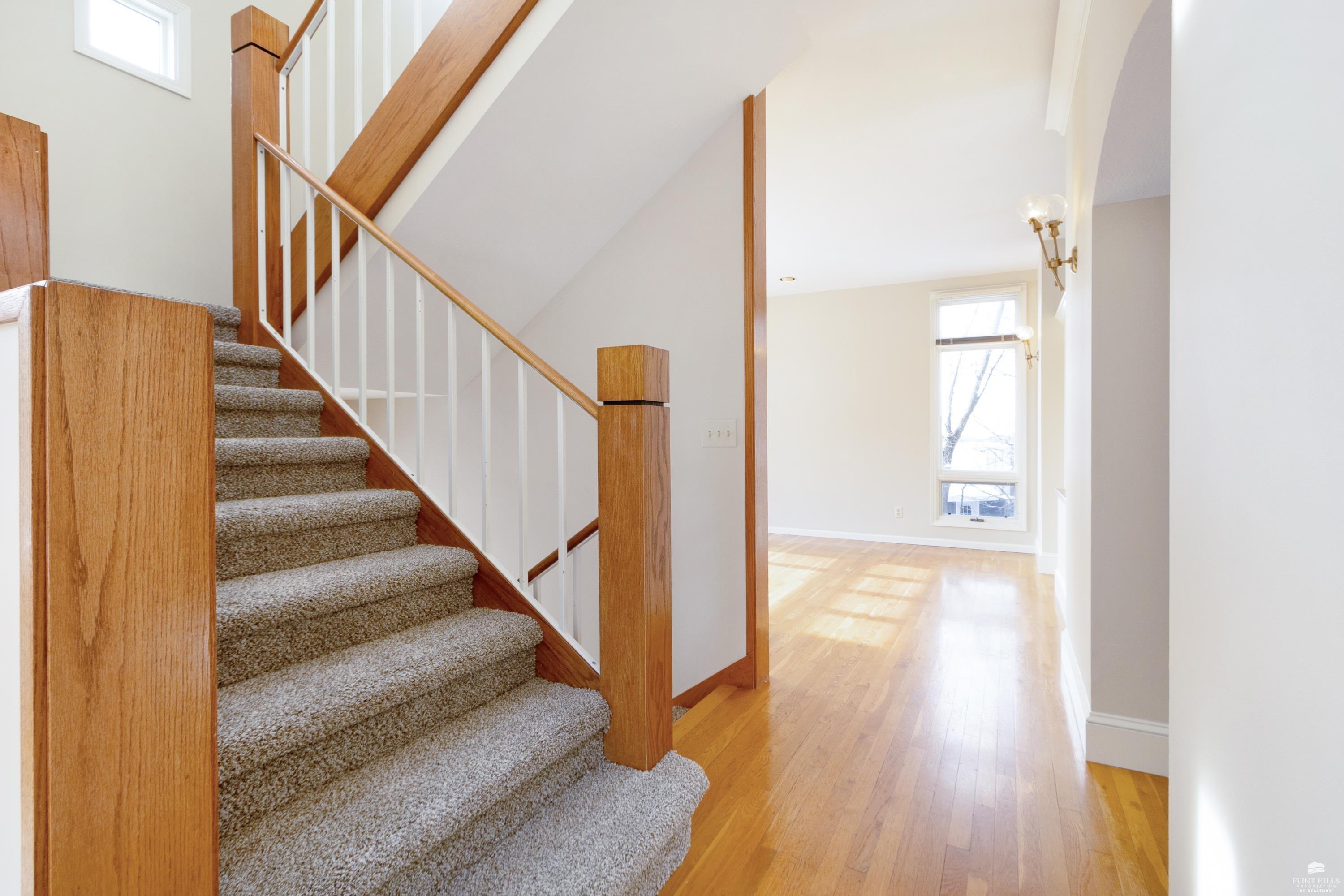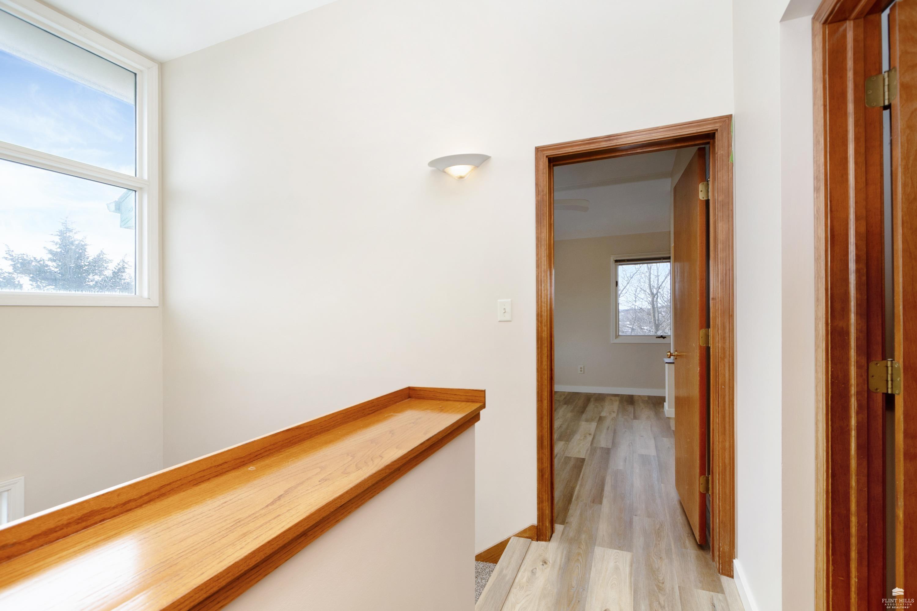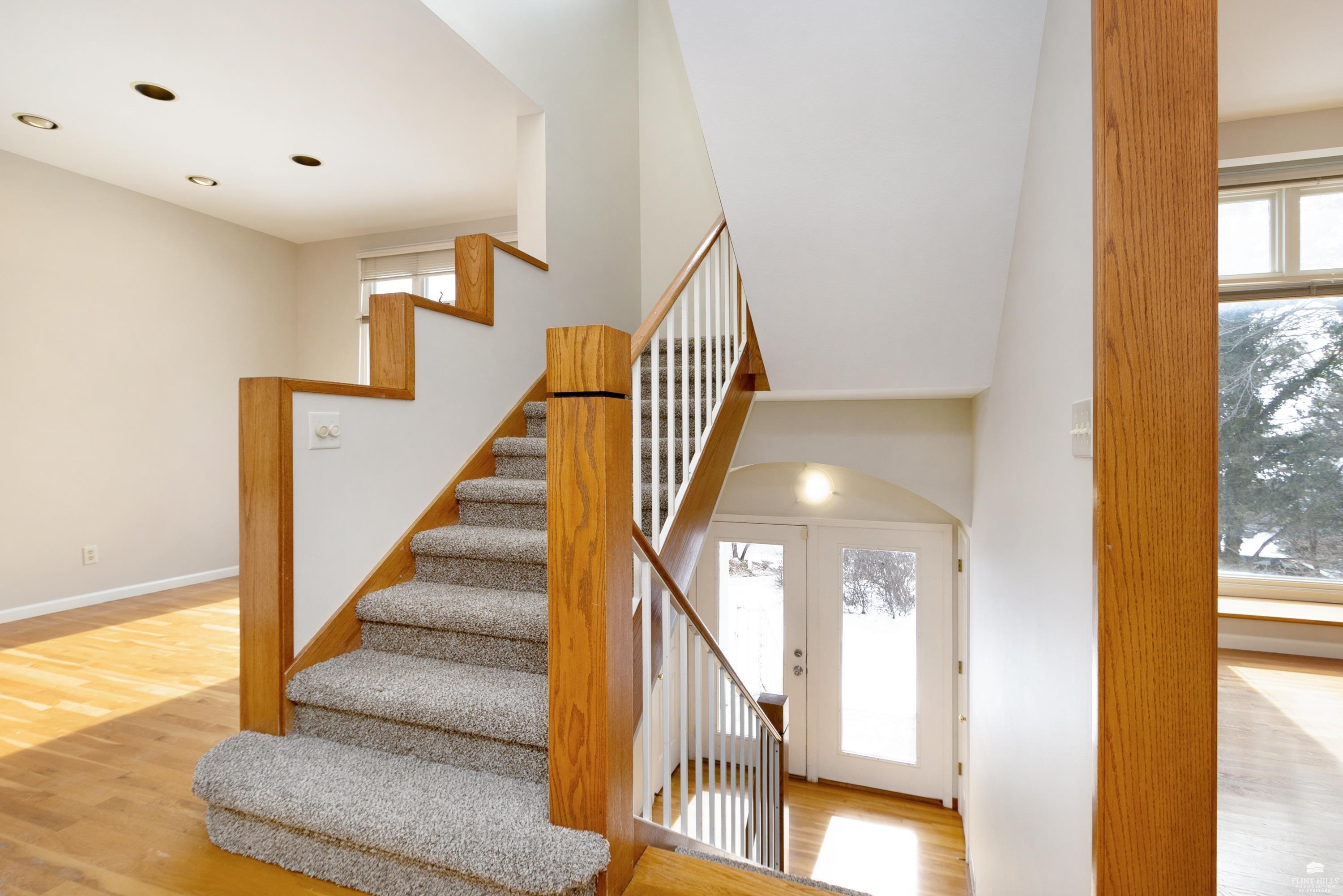 OPEN SUN FEB 8 12:00-1:00 PM Step into this three-plus bedroom contemporary home where dramatic design meets everyday functionality. A soaring entryway welcomes you inside, opening to living and dining areas highlighted by 9-foot ceilings and an outstanding multi-level architectural layout that offers both visual interest and an exceptional amount of built-in storage throughout. The entire upper level is dedicated to a private primary retreat, creating a true sanctuary. The spacious primary sleeping area features a walk-in closet and a generous 11'5" x 9'10" primary bath, complete with an oversized Whirlpool tub, shower, double vanity, and an impressive amount of custom storage. Connected to the primary suite is a 23'5" x 15'6" sitting room or office, offering incredible flexibility. With its own private entrance and closet, this space can function as a fourth bedroom. Situated on a private corner wooded lot with panoramic views. Close to KSU and minutes from the Fort Riley Ogden Gate.
