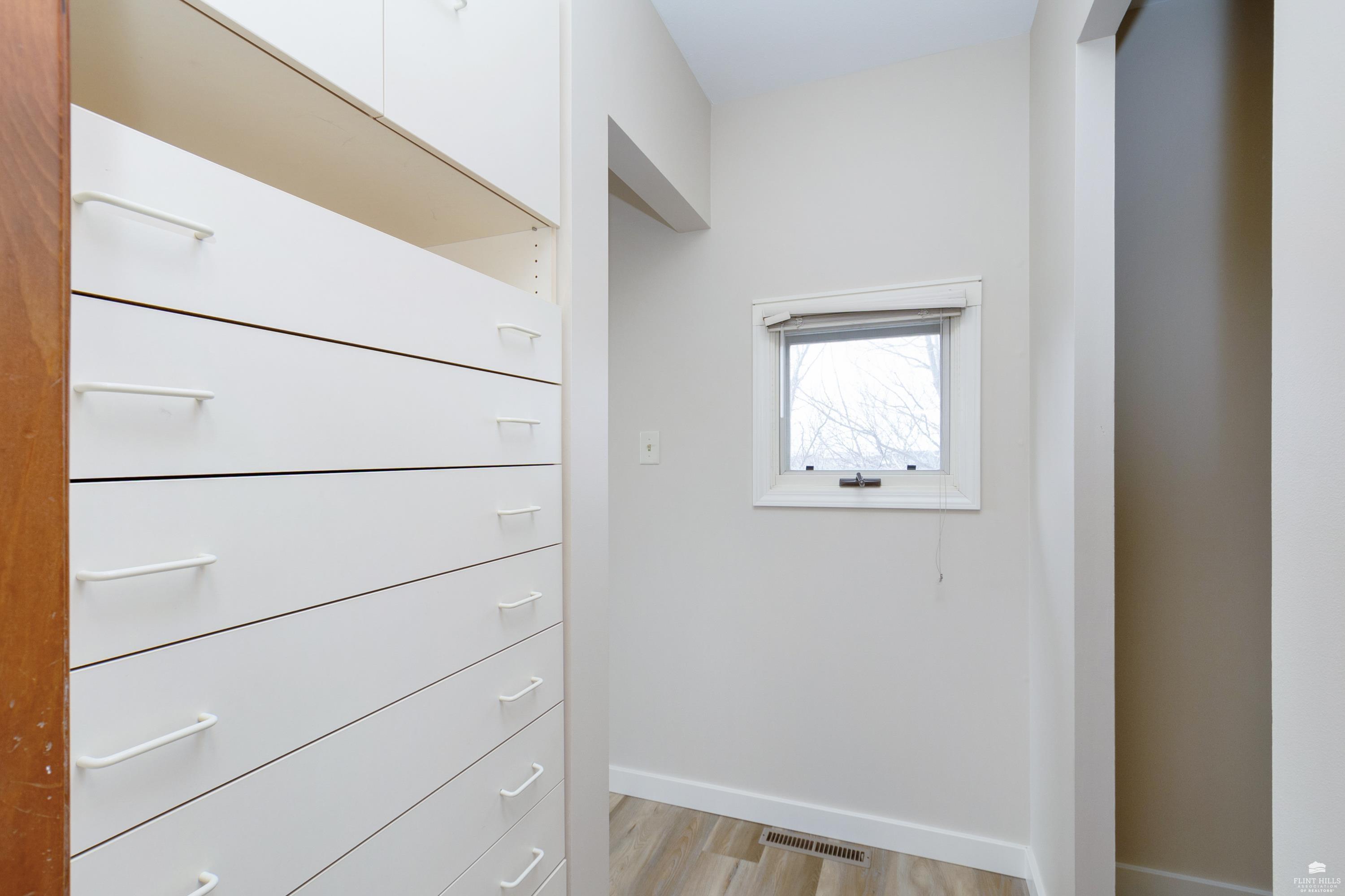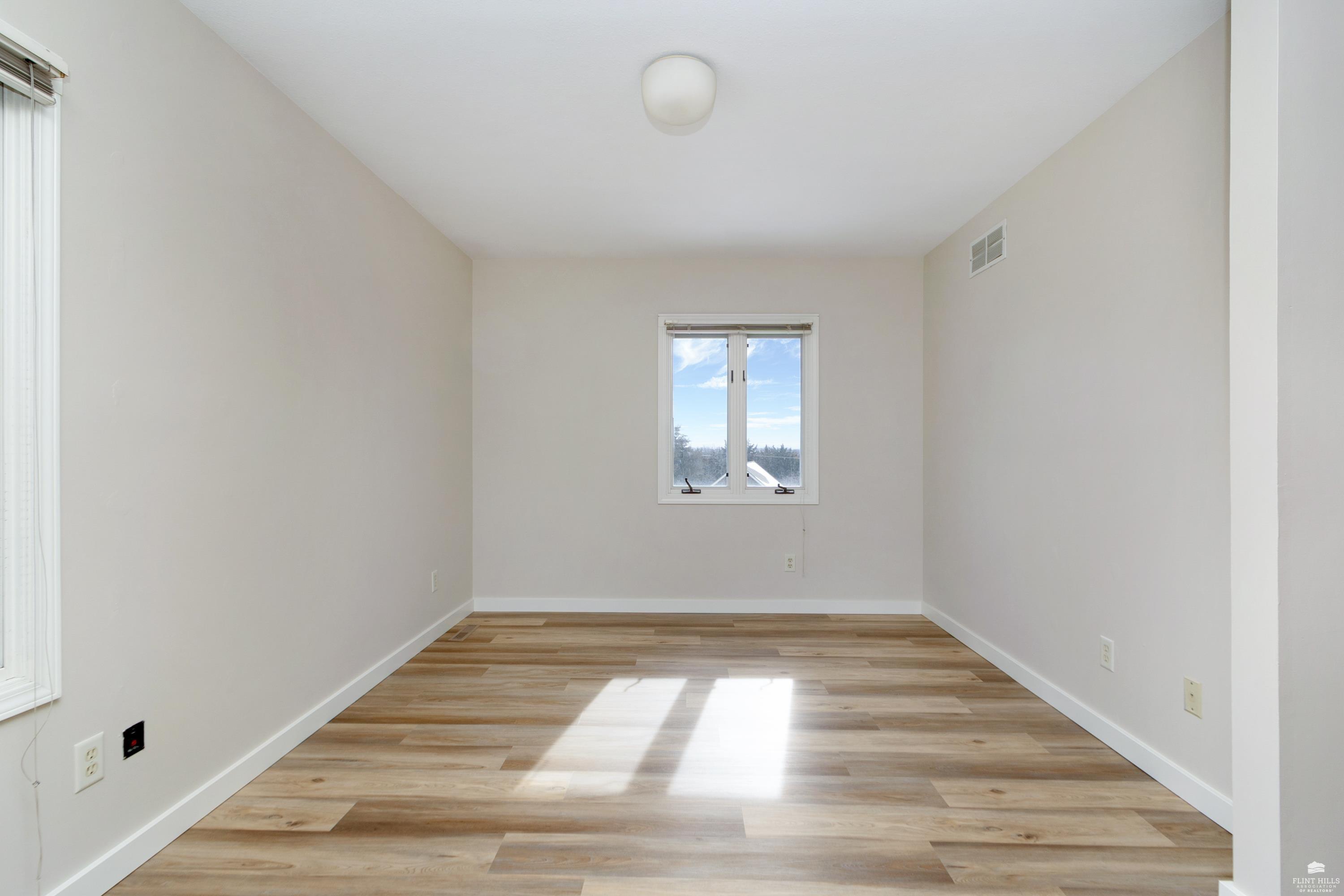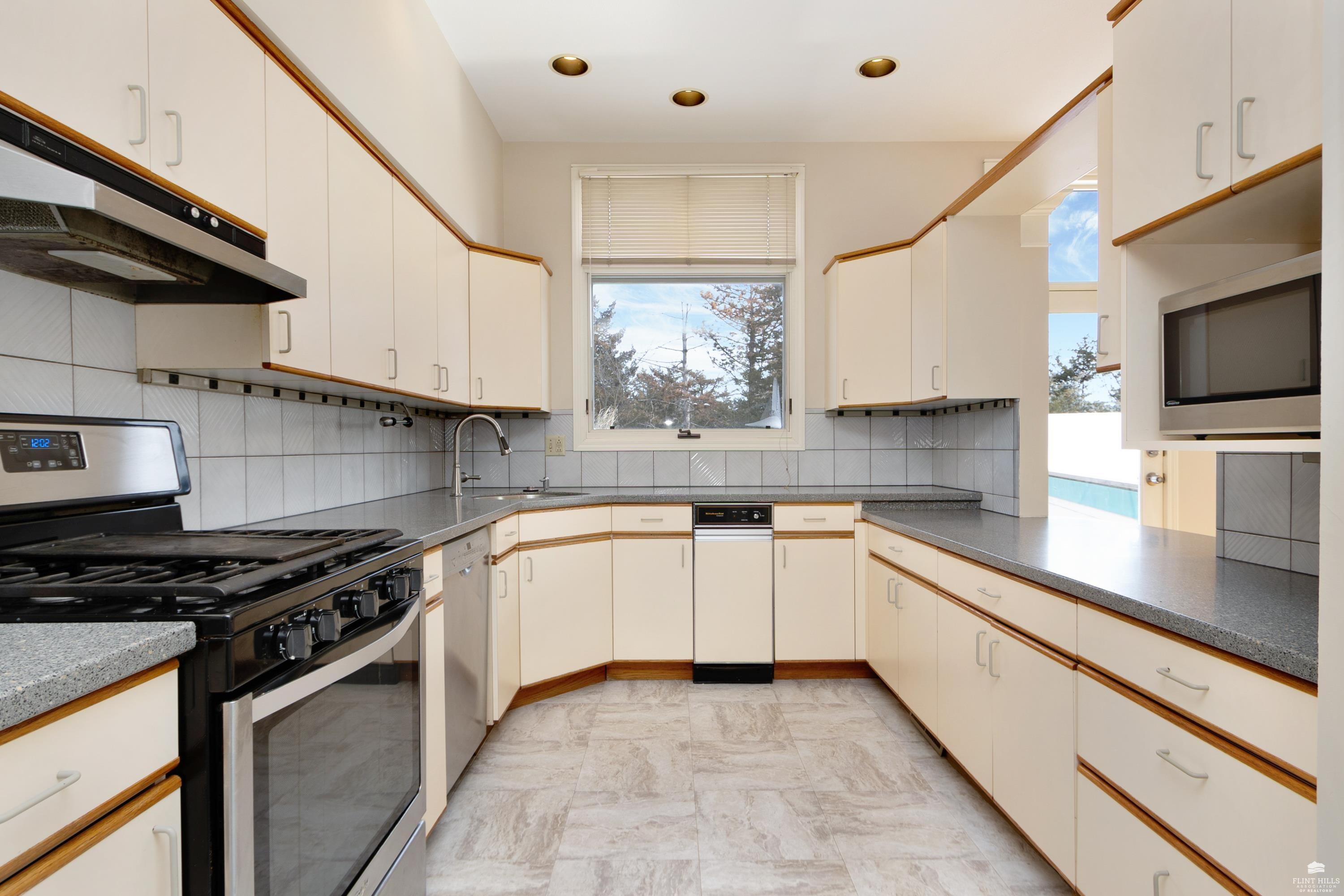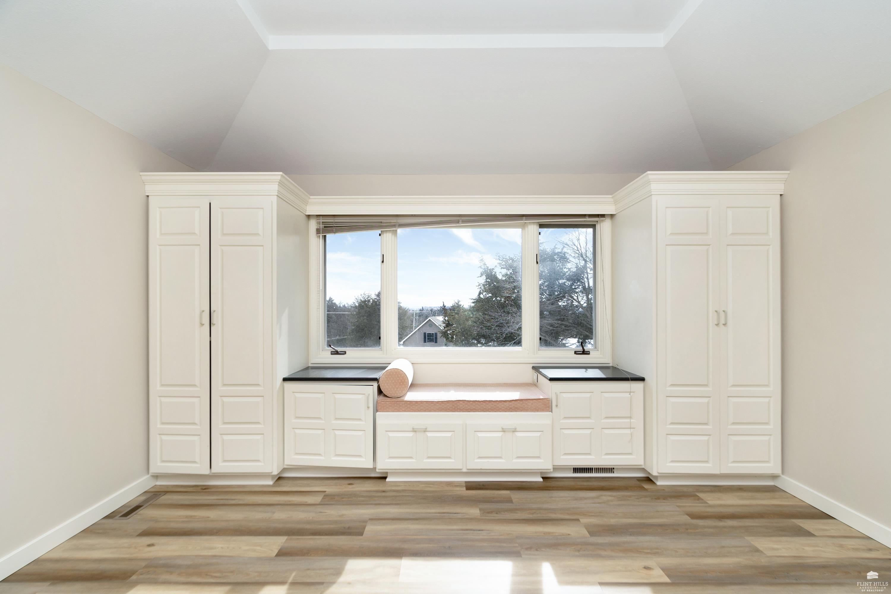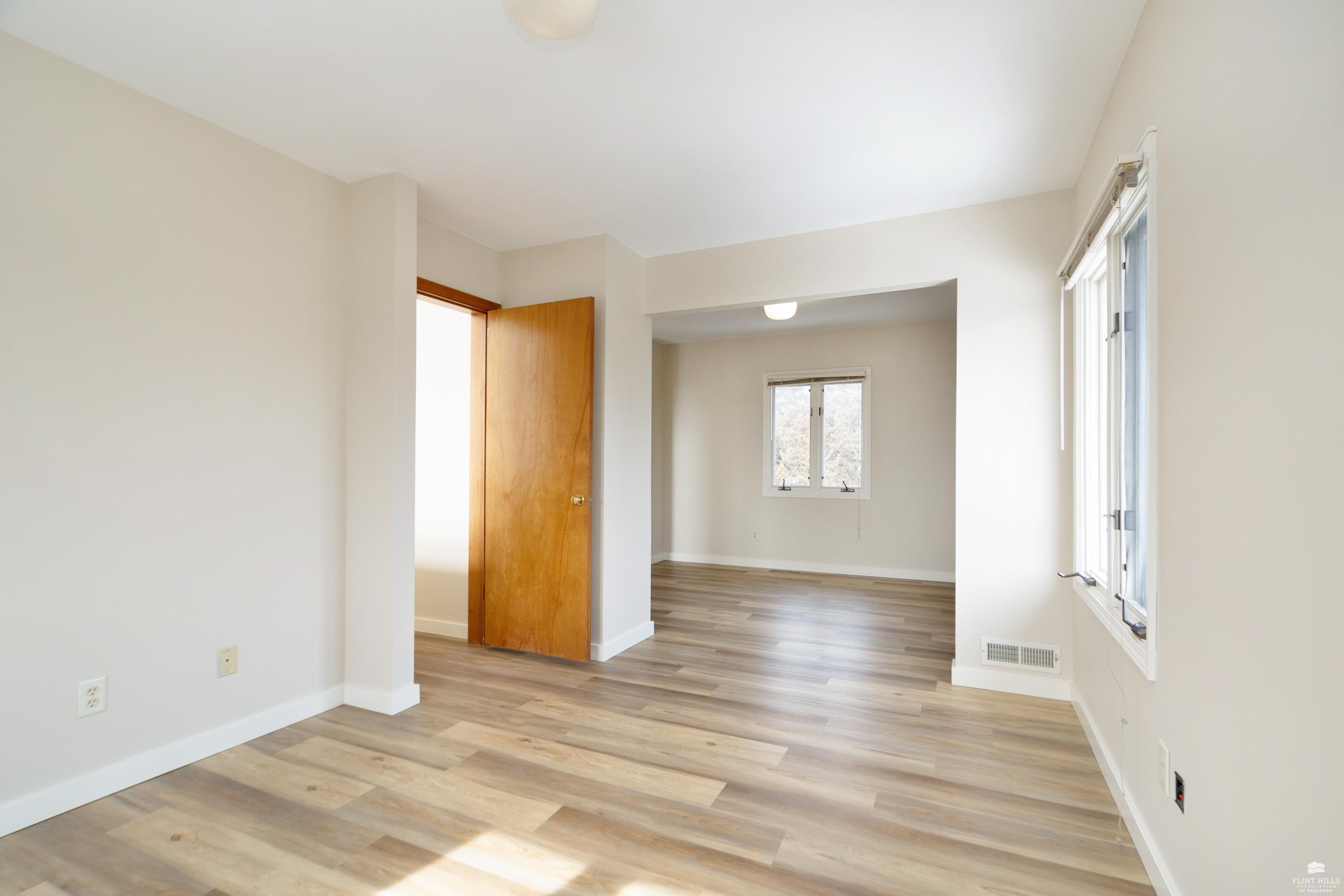 OPEN SUN FEB 8 12:00-1:00 PM Step into this three-plus bedroom contemporary home where dramatic design meets everyday functionality. A soaring entryway welcomes you inside, opening to living and dining areas highlighted by 9-foot ceilings and an outstanding multi-level architectural layout that offers both visual interest and an exceptional amount of built-in storage throughout. The entire upper level is dedicated to a private primary retreat, creating a true sanctuary. The spacious primary sleeping area features a walk-in closet and a generous 11'5" x 9'10" primary bath, complete with an oversized Whirlpool tub, shower, double vanity, and an impressive amount of custom storage. Connected to the primary suite is a 23'5" x 15'6" sitting room or office, offering incredible flexibility. With its own private entrance and closet, this space can function as a fourth bedroom. Situated on a private corner wooded lot with panoramic views. Close to KSU and minutes from the Fort Riley Ogden Gate.