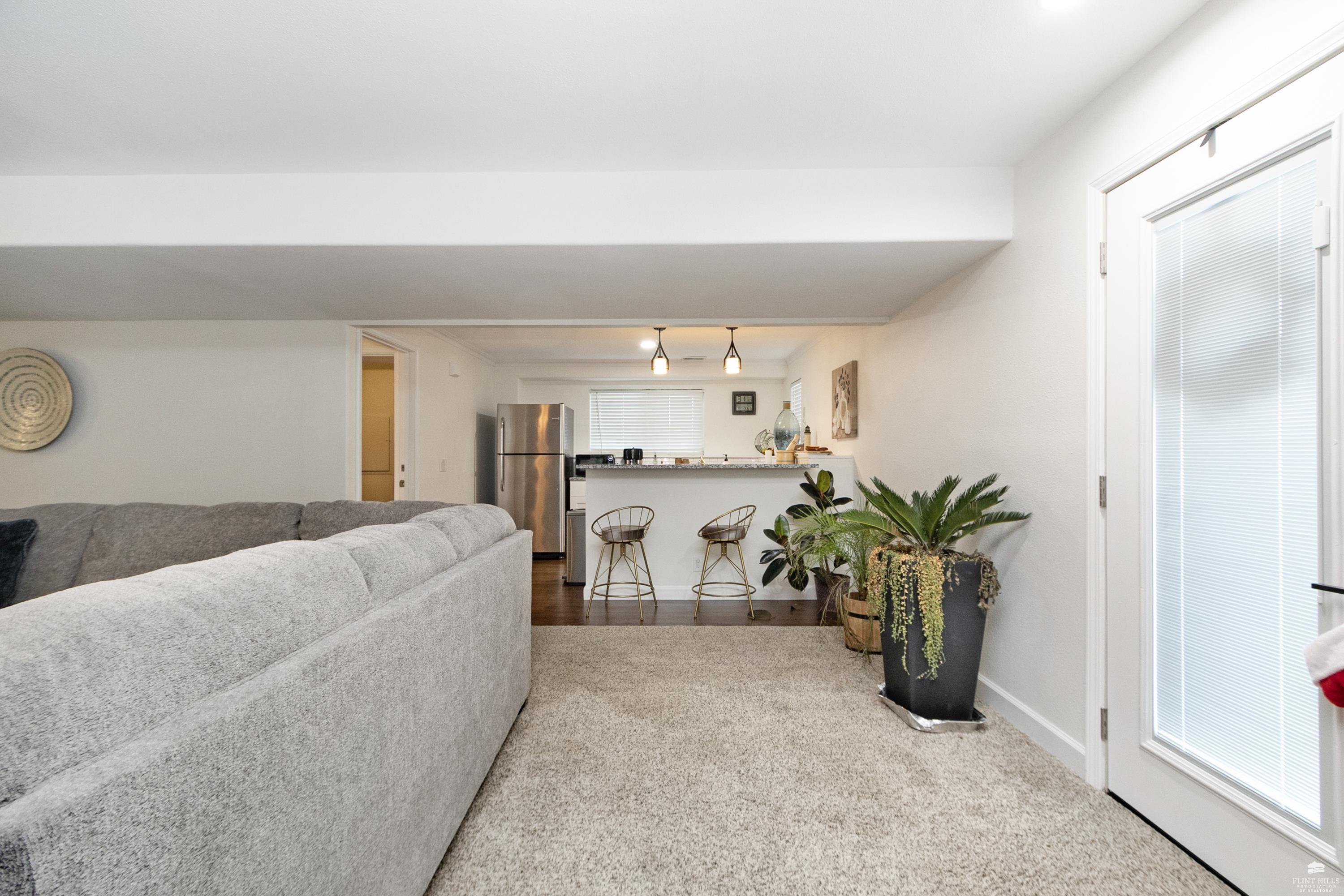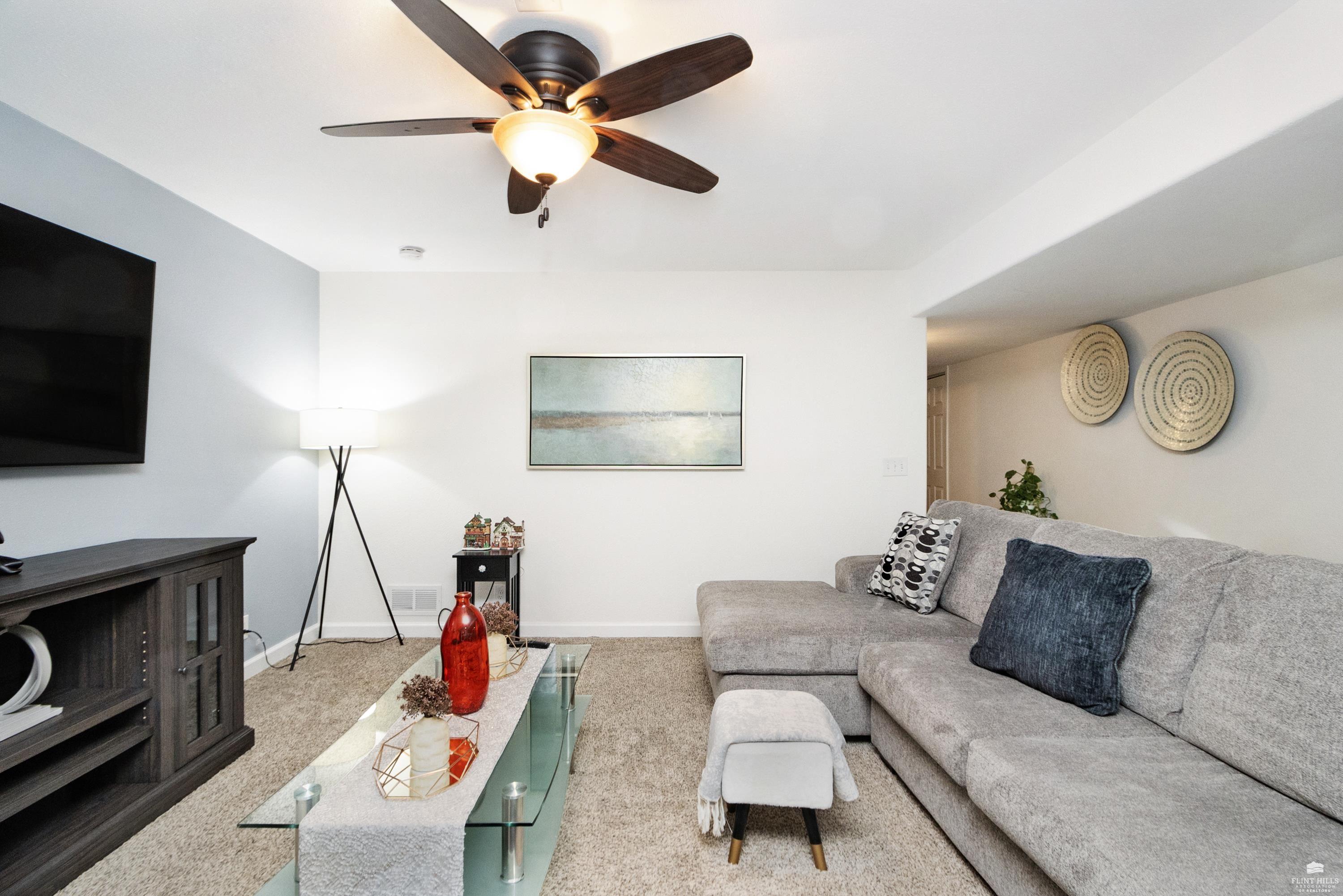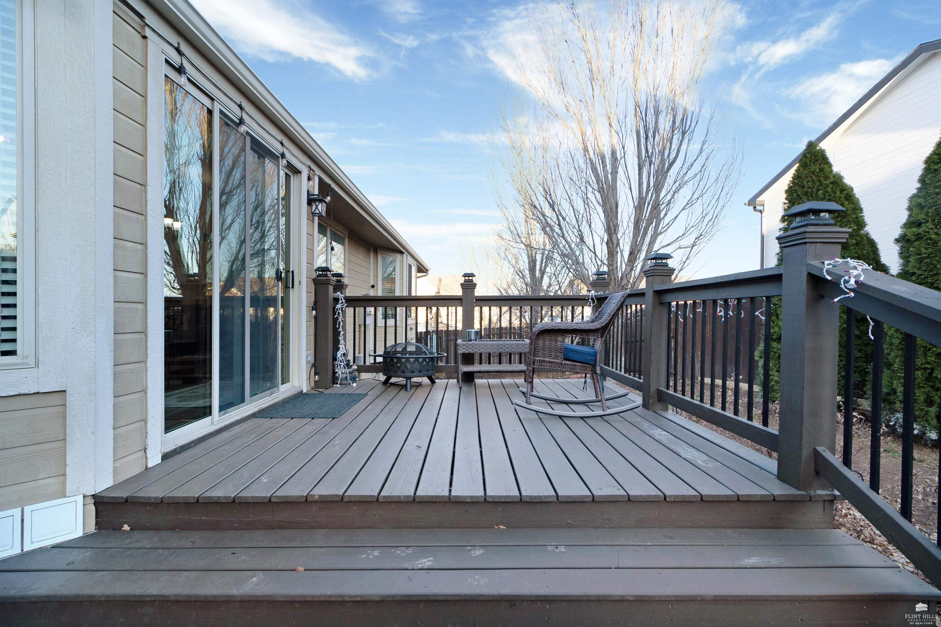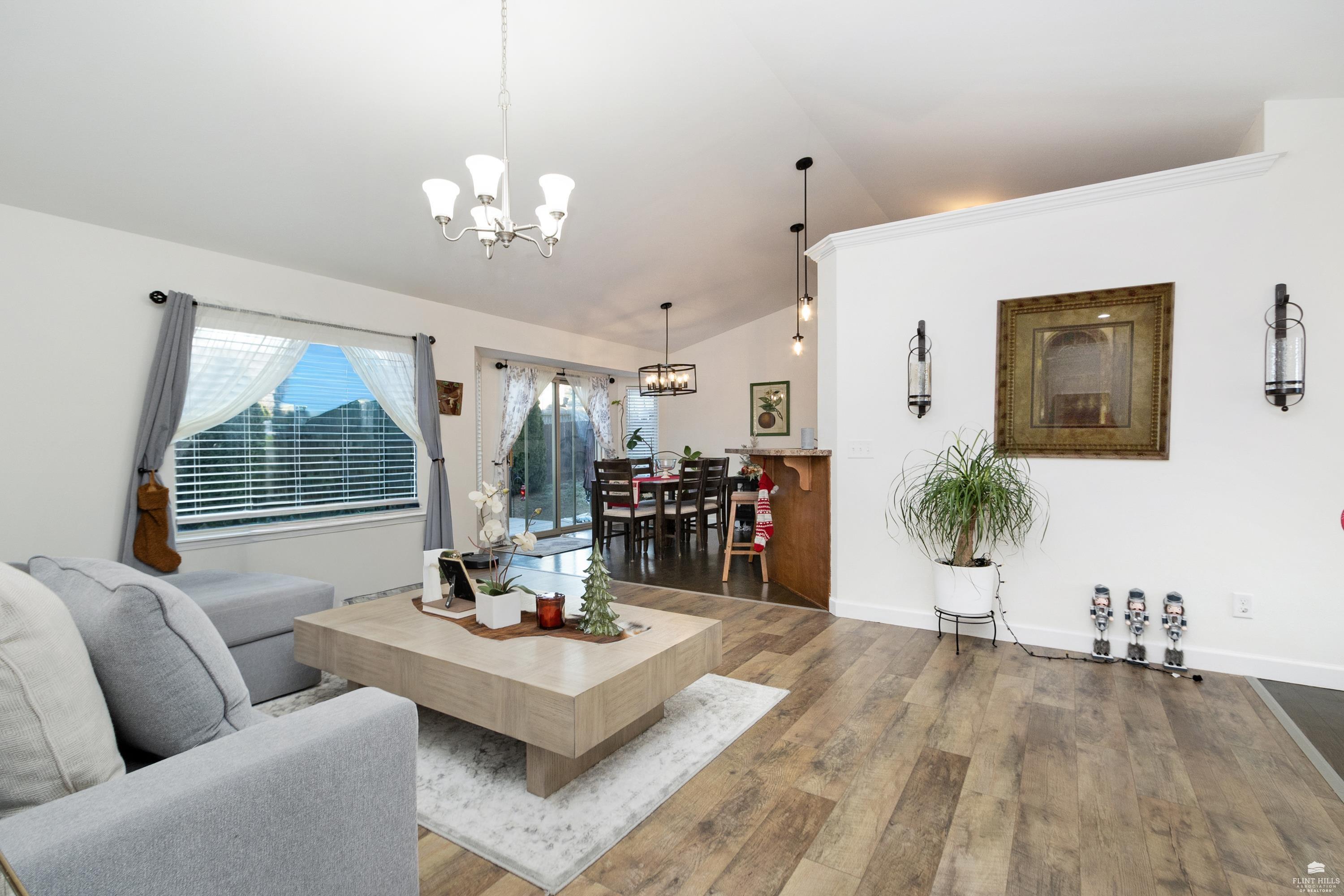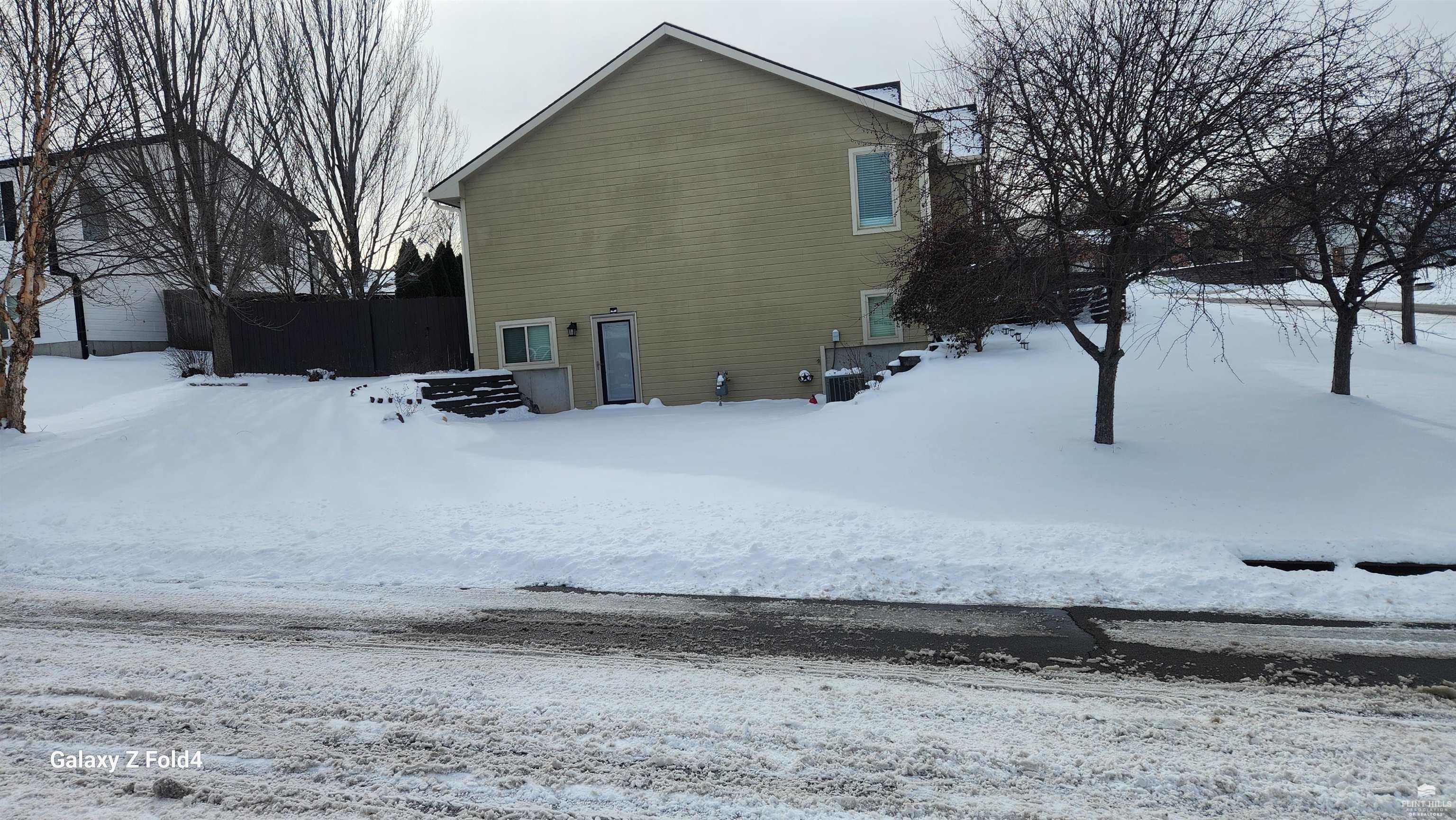 OPEN SUN FEB 8 FROM 1:30 PM UNTIL 2:30 PM This well-maintained West side residence offers 5 bedrooms and 3 bathrooms, situated on a desirable corner lot with a walkout basement. A 6th nonconforming bedroom in the basement provides flexible use as a home office, or fitness room. The kitchen features wood cabinetry, abundance of counter space, and a full walk-in pantry. The open-concept living room offers vaulted ceilings, creating a bright and spacious living area. The primary suite includes an over sized walk-in closet, an oversized private bathroom with a double vanity. The lower level offers a large family room with a full wet bar and private entrance, making it well-suited for game day or holiday entertaining. Outdoor features include a deck and a wood privacy fence. Conveniently located near the Ogden Gate at Fort Riley, Kansas State University, Colbert Hills Golf Course, Stagg Hill Golf Course and Annenberg Park.