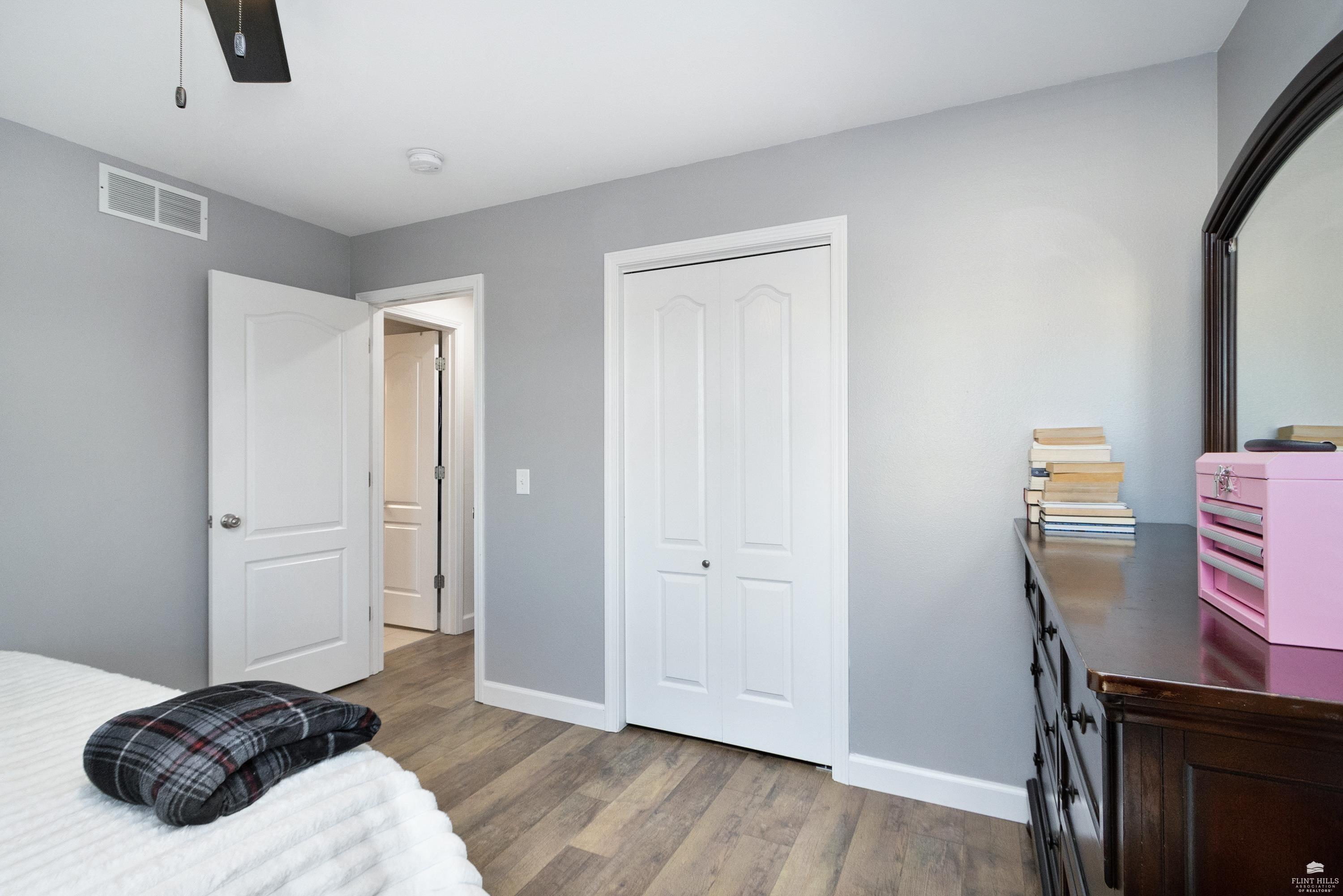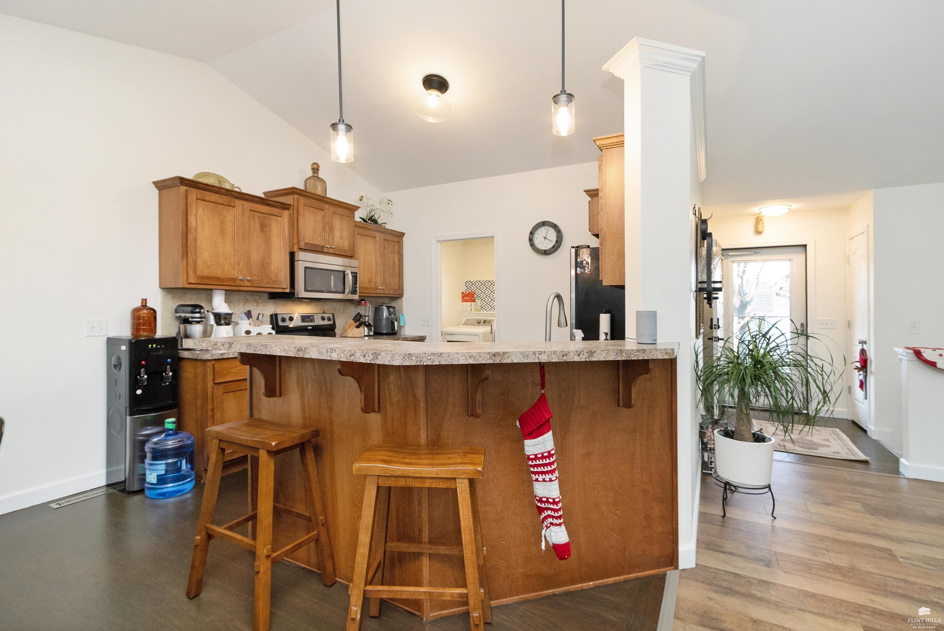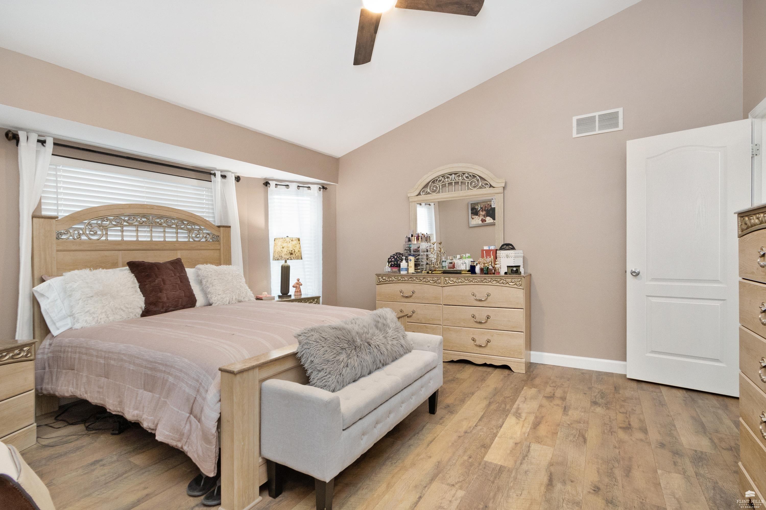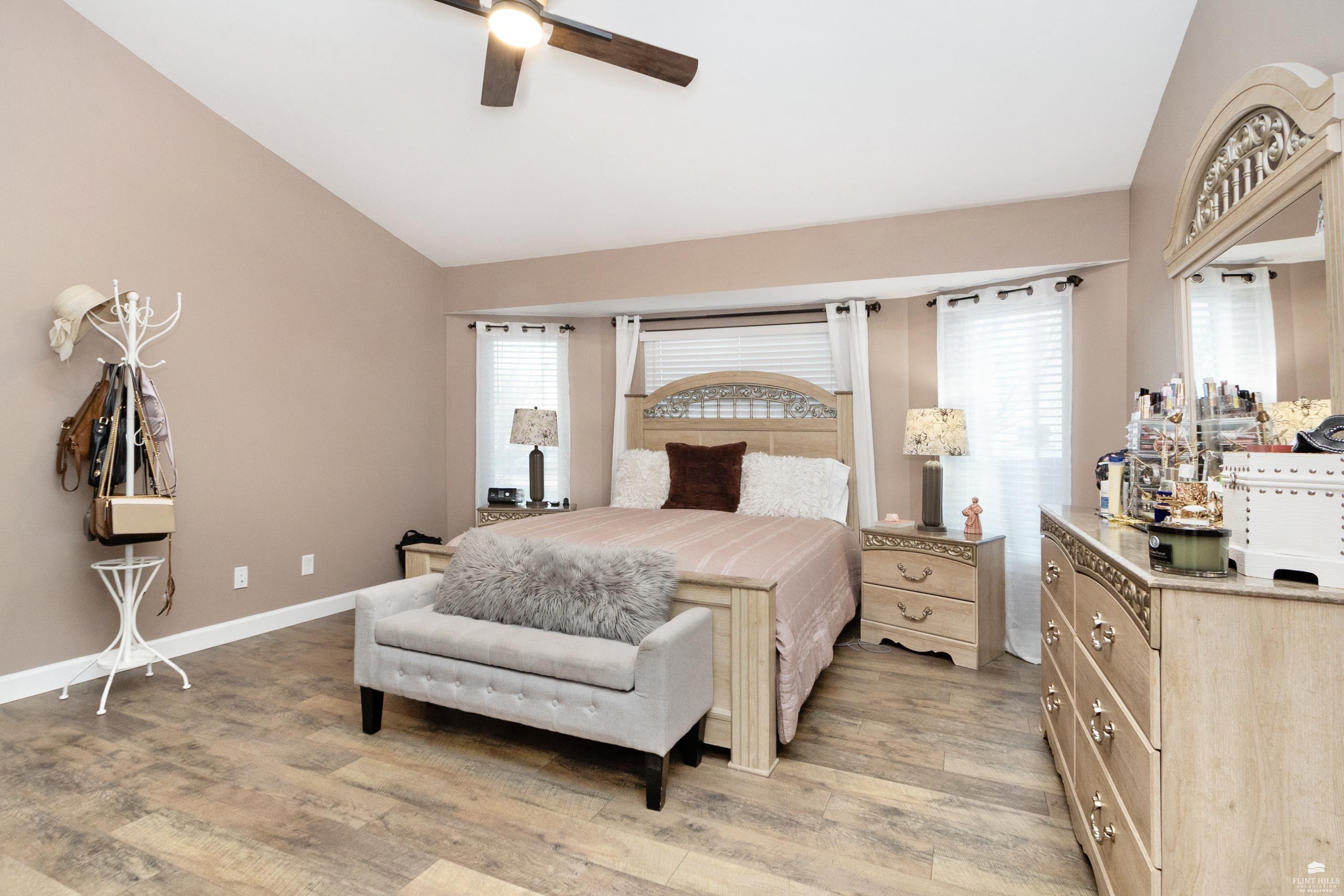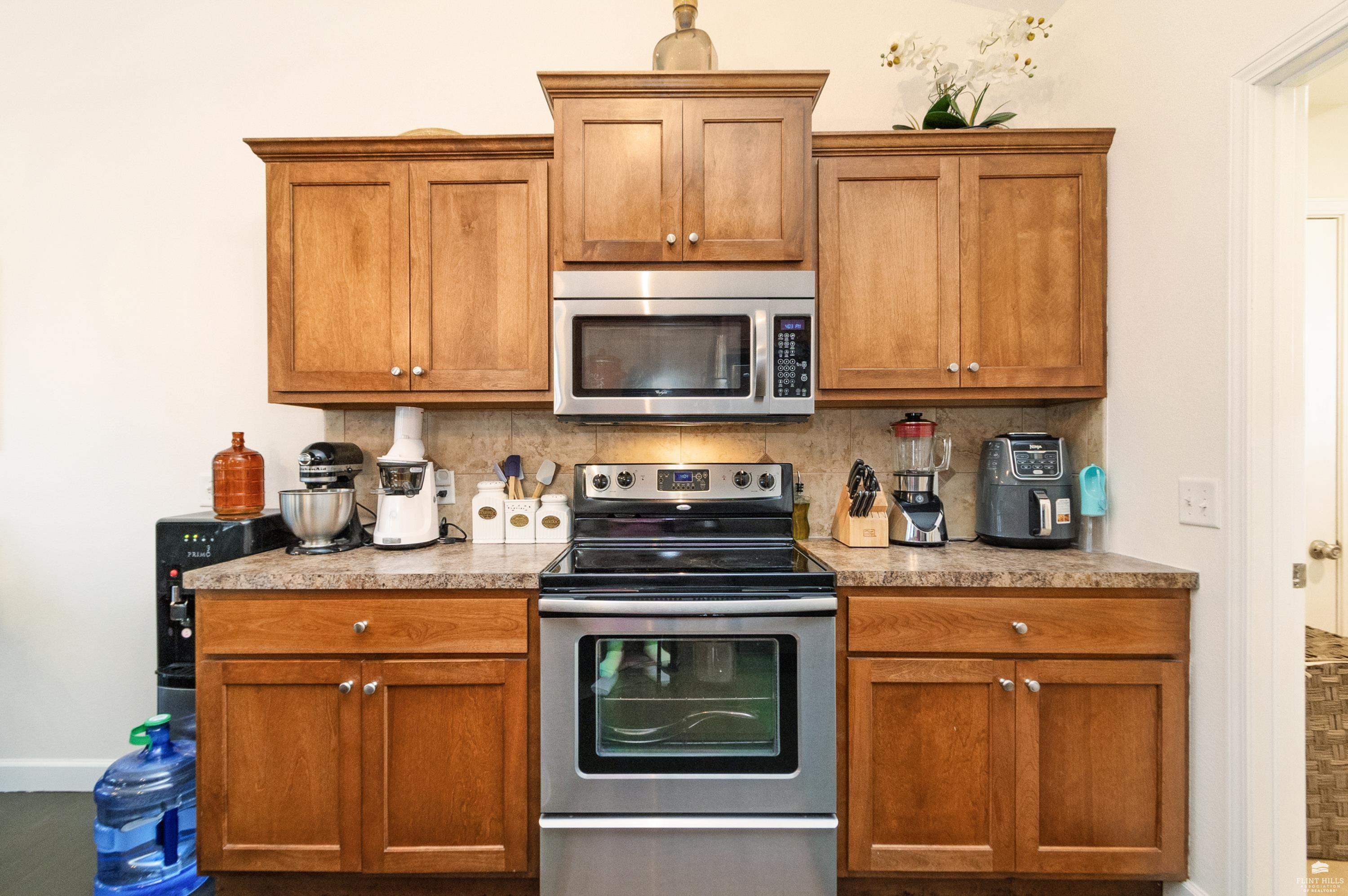 OPEN SUN FEB 8 FROM 1:30 PM UNTIL 2:30 PM This well-maintained West side residence offers 5 bedrooms and 3 bathrooms, situated on a desirable corner lot with a walkout basement. A 6th nonconforming bedroom in the basement provides flexible use as a home office, or fitness room. The kitchen features wood cabinetry, abundance of counter space, and a full walk-in pantry. The open-concept living room offers vaulted ceilings, creating a bright and spacious living area. The primary suite includes an over sized walk-in closet, an oversized private bathroom with a double vanity. The lower level offers a large family room with a full wet bar and private entrance, making it well-suited for game day or holiday entertaining. Outdoor features include a deck and a wood privacy fence. Conveniently located near the Ogden Gate at Fort Riley, Kansas State University, Colbert Hills Golf Course, Stagg Hill Golf Course and Annenberg Park.